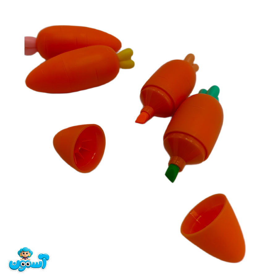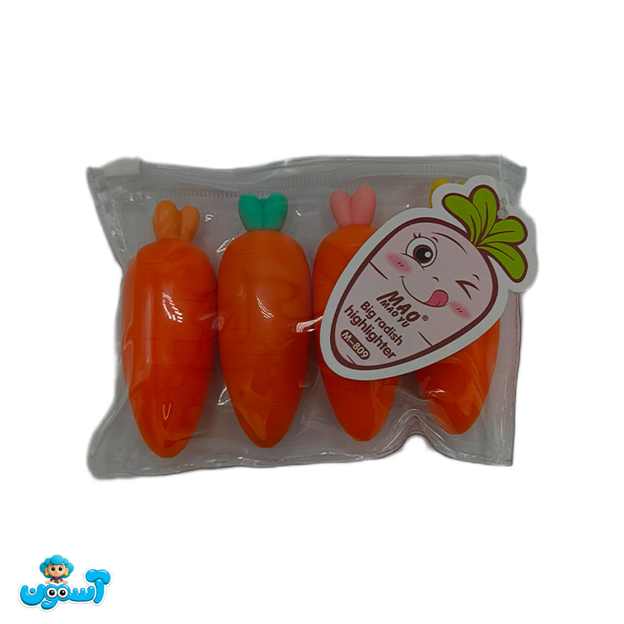 ست ۴تایی هایلایتر طرح هویج با بدنه بامزه و اندازهٔ جیبی؛ نوک مورب برای خطکشی دقیق یا پهن، و کیف زیپدار شفاف برای حمل آسان.