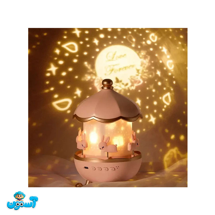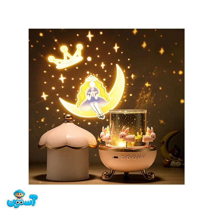 خرگوشهای کوچولو دور تا دور چراغ میچرخن و طرحهای فانتزی ستاره، ماه، پری دریایی و موجودات دریایی رو روی دیوار و سقف پخش میکنن؛ هم چراغ خوابه، هم پروژکتوره، هم یه موزیکپلیر بامزه. 🎠✨