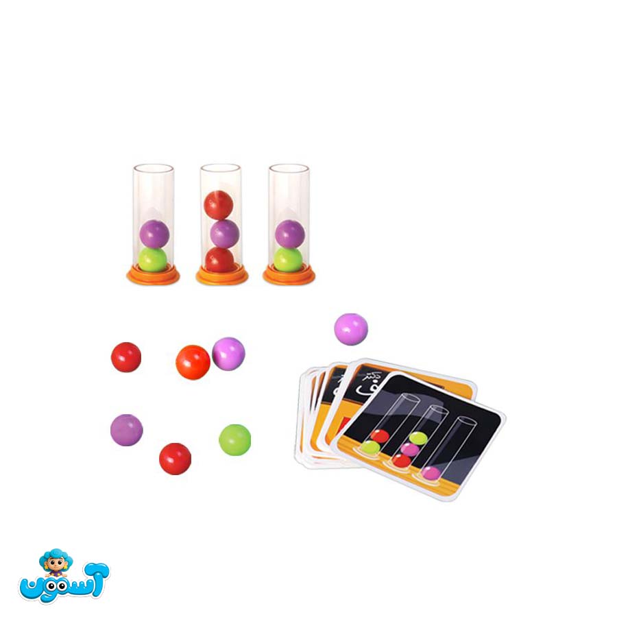 ۲) یک کارت الگو رو کنید. همه همزمان شروع میکنند تا چیدمان کارت را فقط با ریختن گویها بین لولهها بسازند. لمس مستقیم گویها ممنوع است.